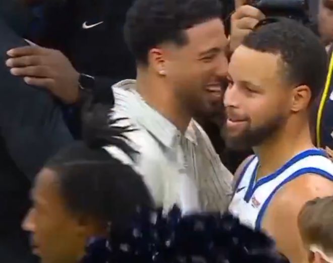 赛后,库里和步行者后卫哈利伯顿拥抱热聊。